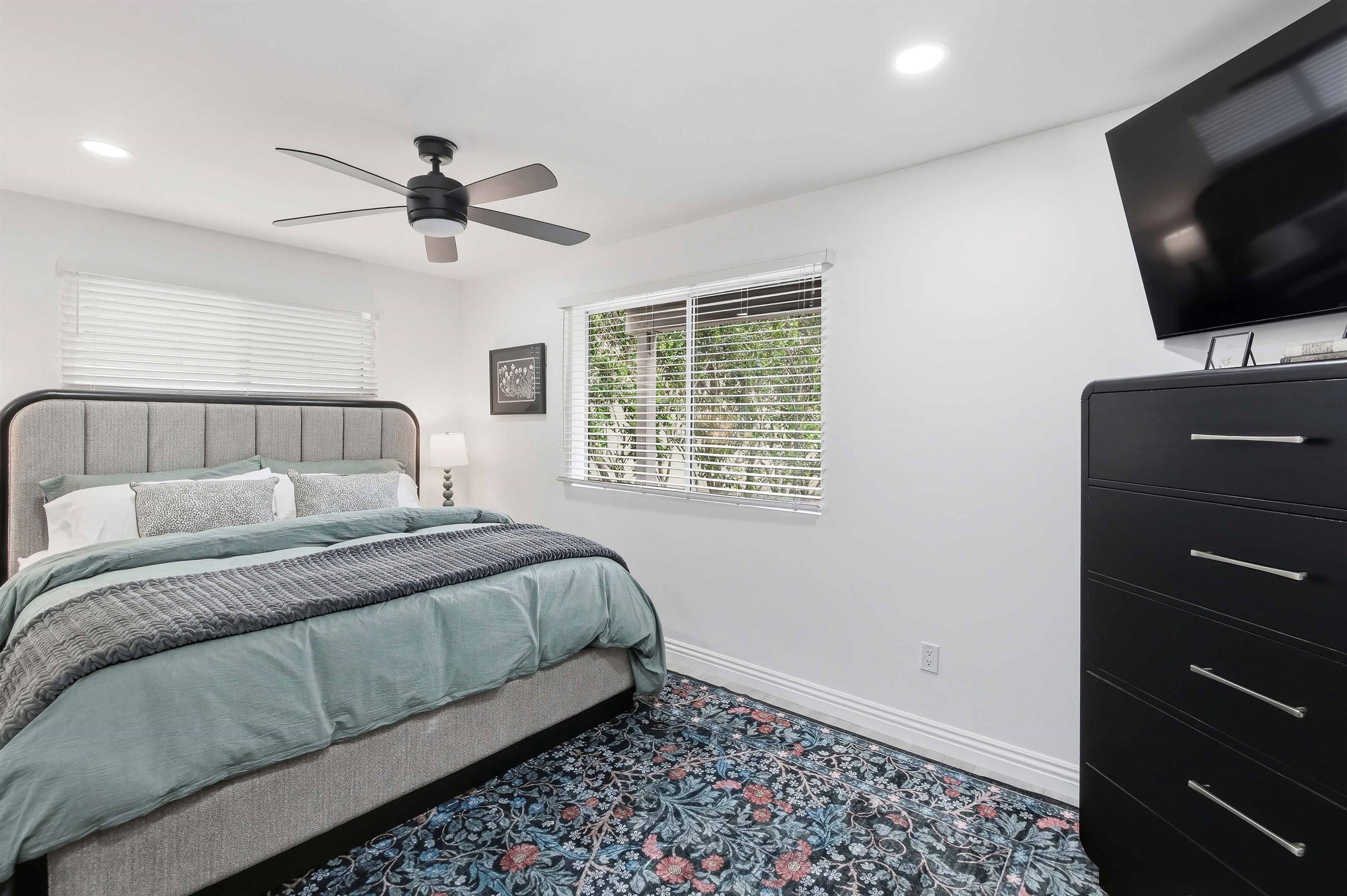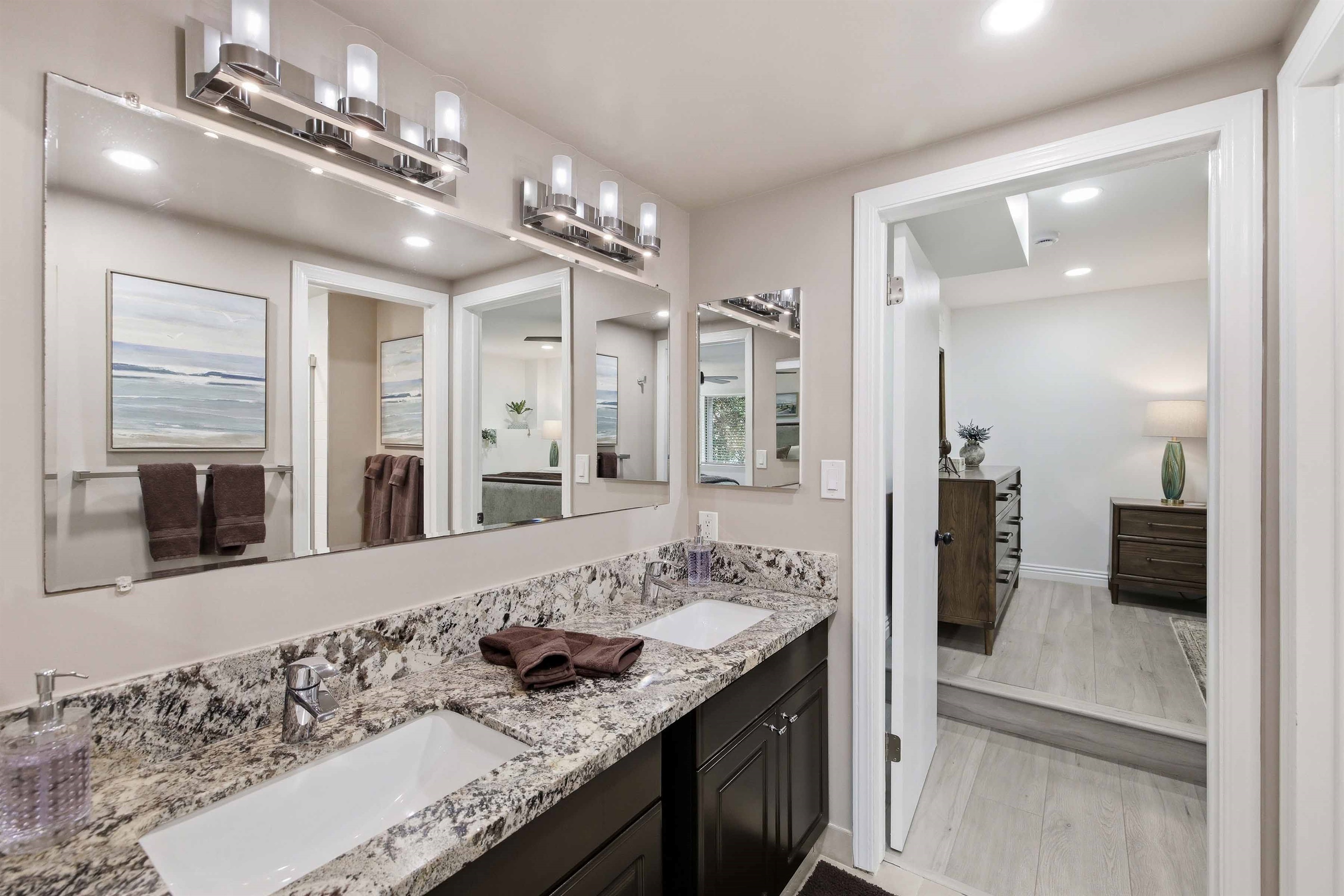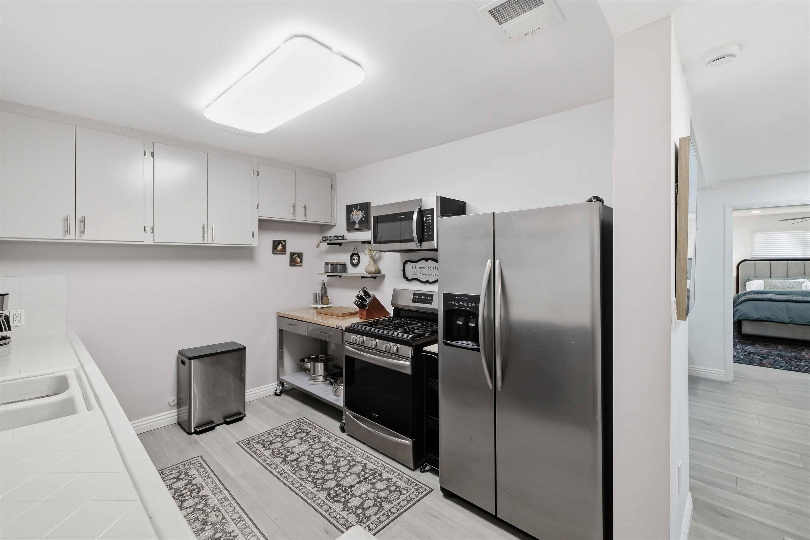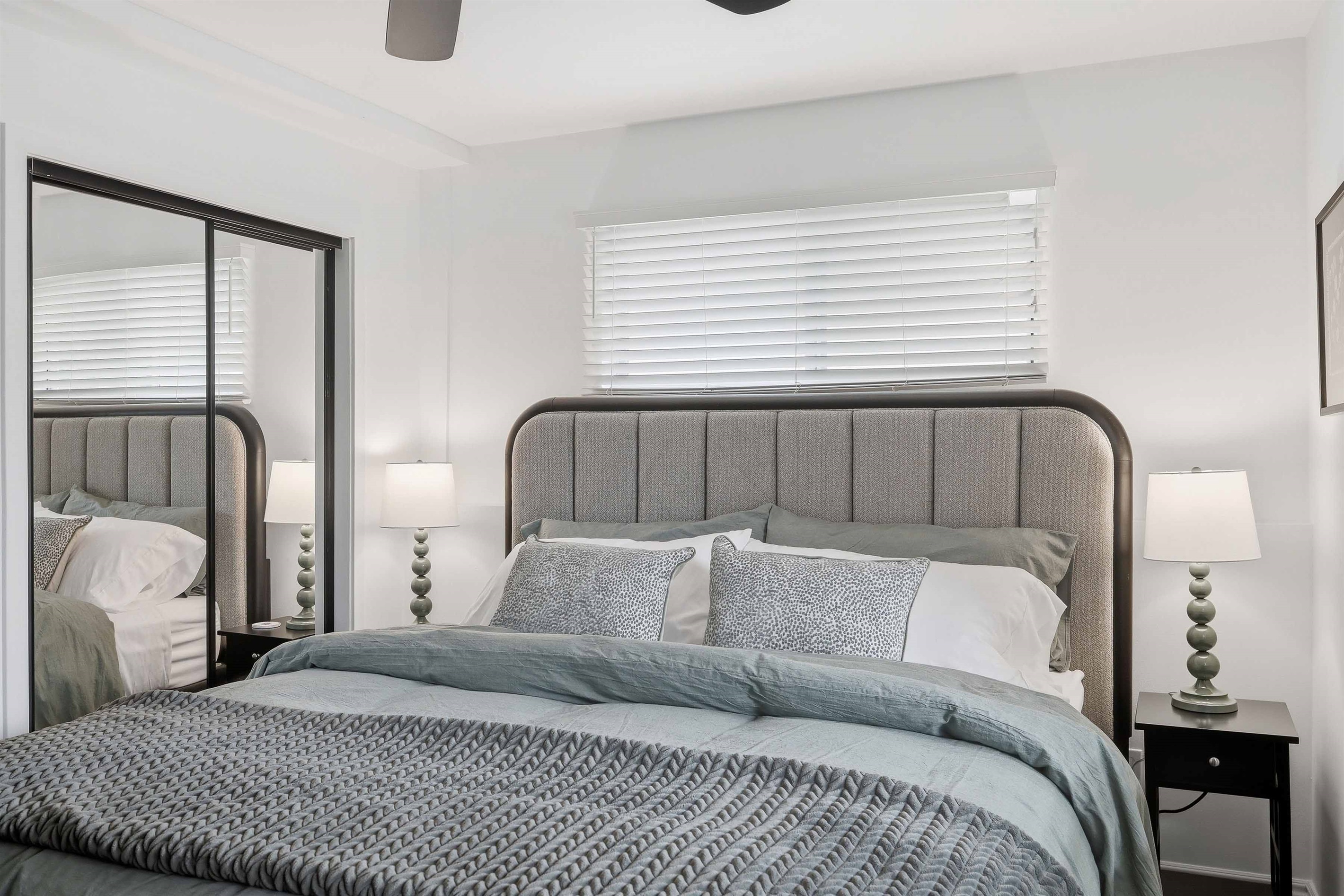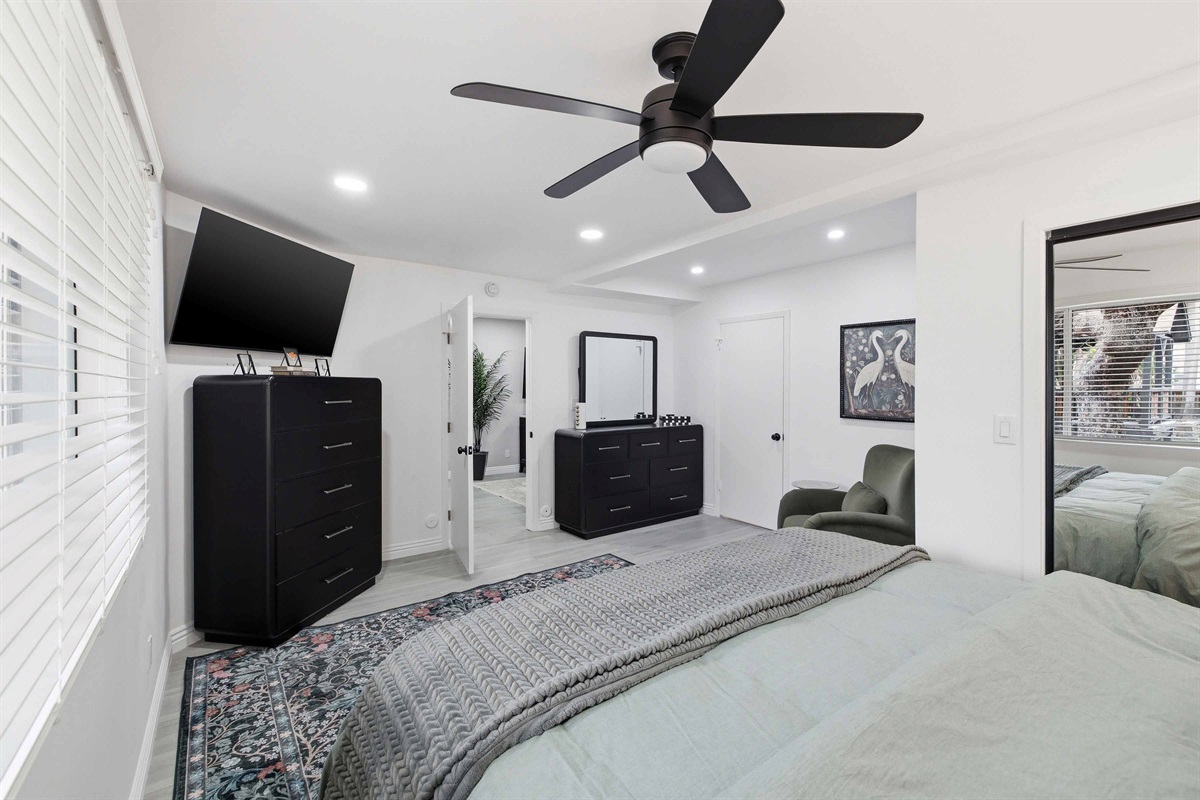 Beautifully remodeled 2-Bed (1-King & 1-California King) 2-Bath lower-rear unit with 850 Sq. Ft. of bright, comfortable living space on a quiet street with air conditioning! This single-level apartment features an open kitchen, stylish chandelier/furnishings, & a great flow throughout.