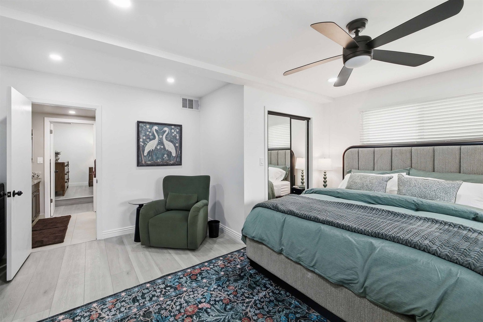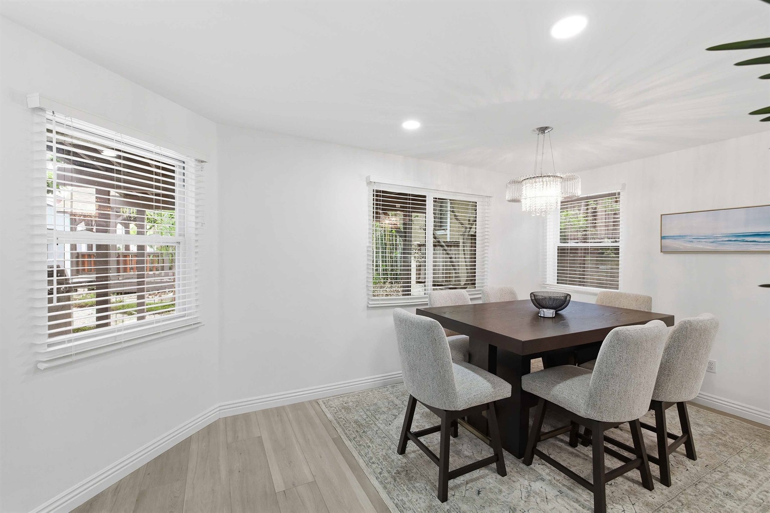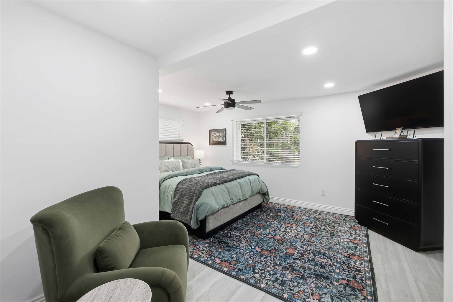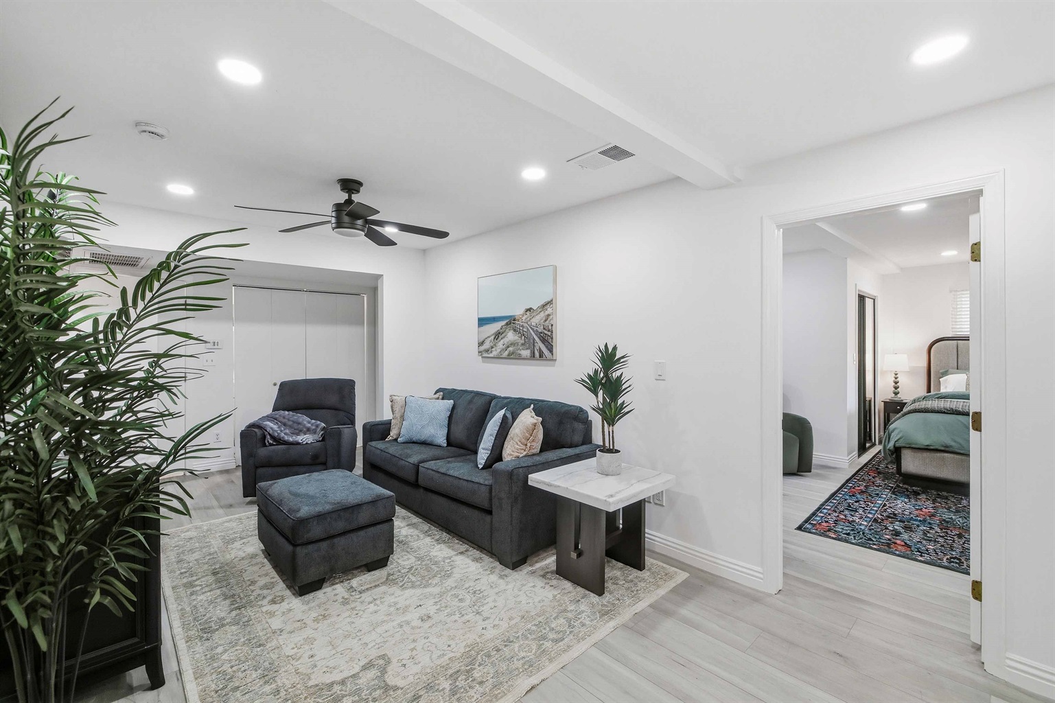 Beautifully remodeled 2-Bed (1-King & 1-California King) 2-Bath lower-rear unit with 850 Sq. Ft. of bright, comfortable living space on a quiet street with air conditioning! This single-level apartment features an open kitchen, stylish chandelier/furnishings, & a great flow throughout.